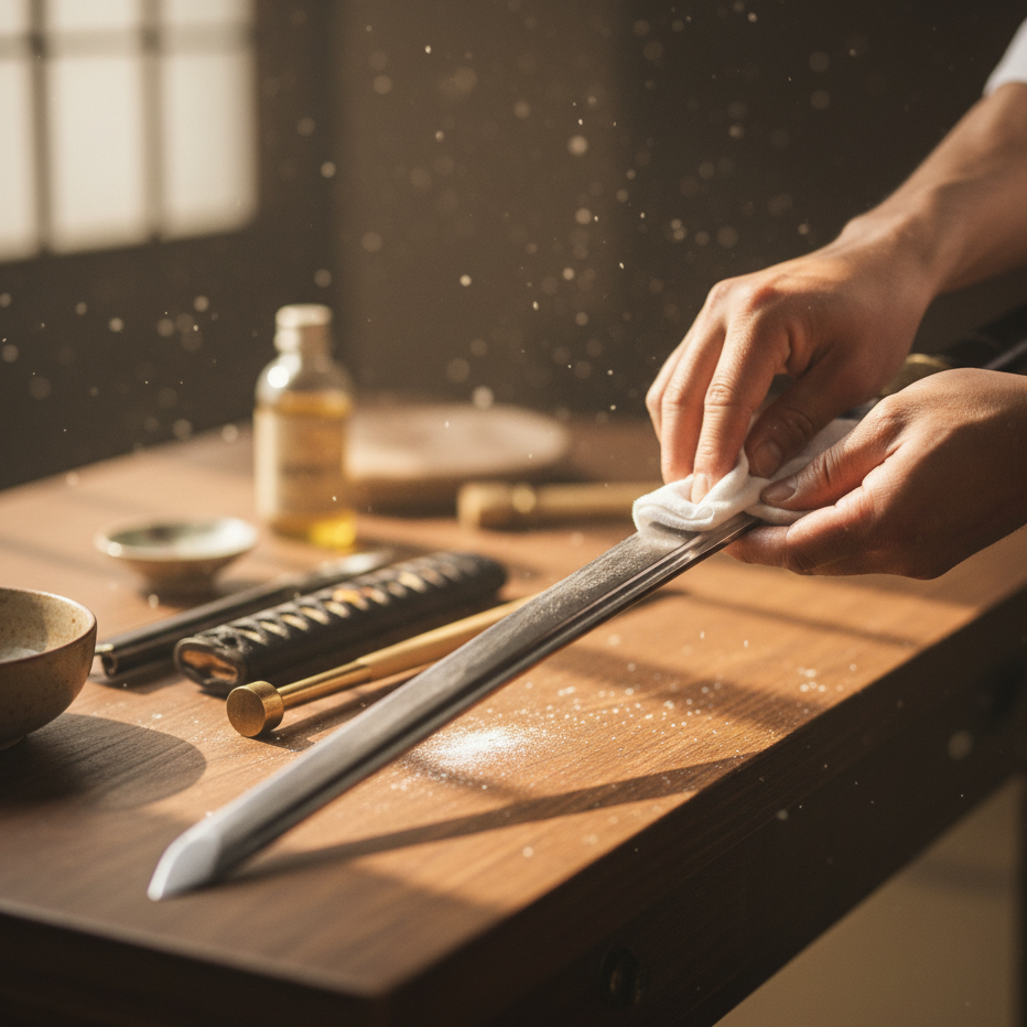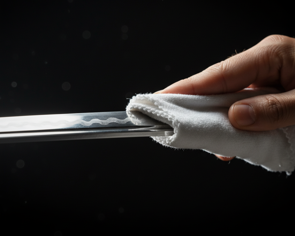 L’entretien d’un katana est essentiel pour préserver la qualité de sa lame et de ses finitions. Après chaque manipulation, il est recommandé d’essuyer la lame avec un chiffon doux et sec afin d’éliminer toute trace d’humidité ou de contact avec la peau.