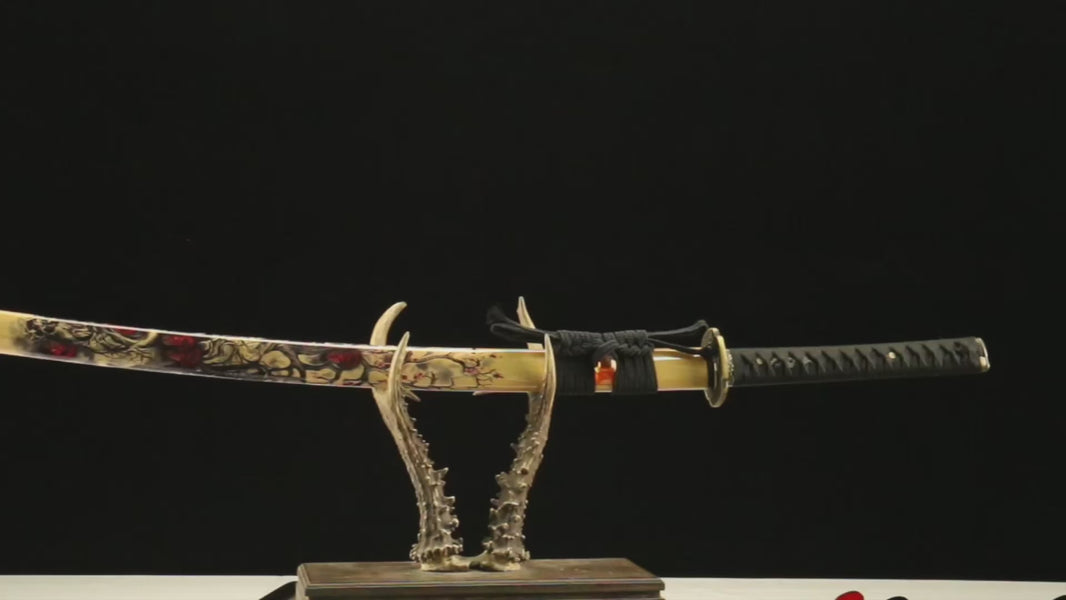 Katana Hanagin — Trempe argile — Saya gravée motifs floraux nacrés
