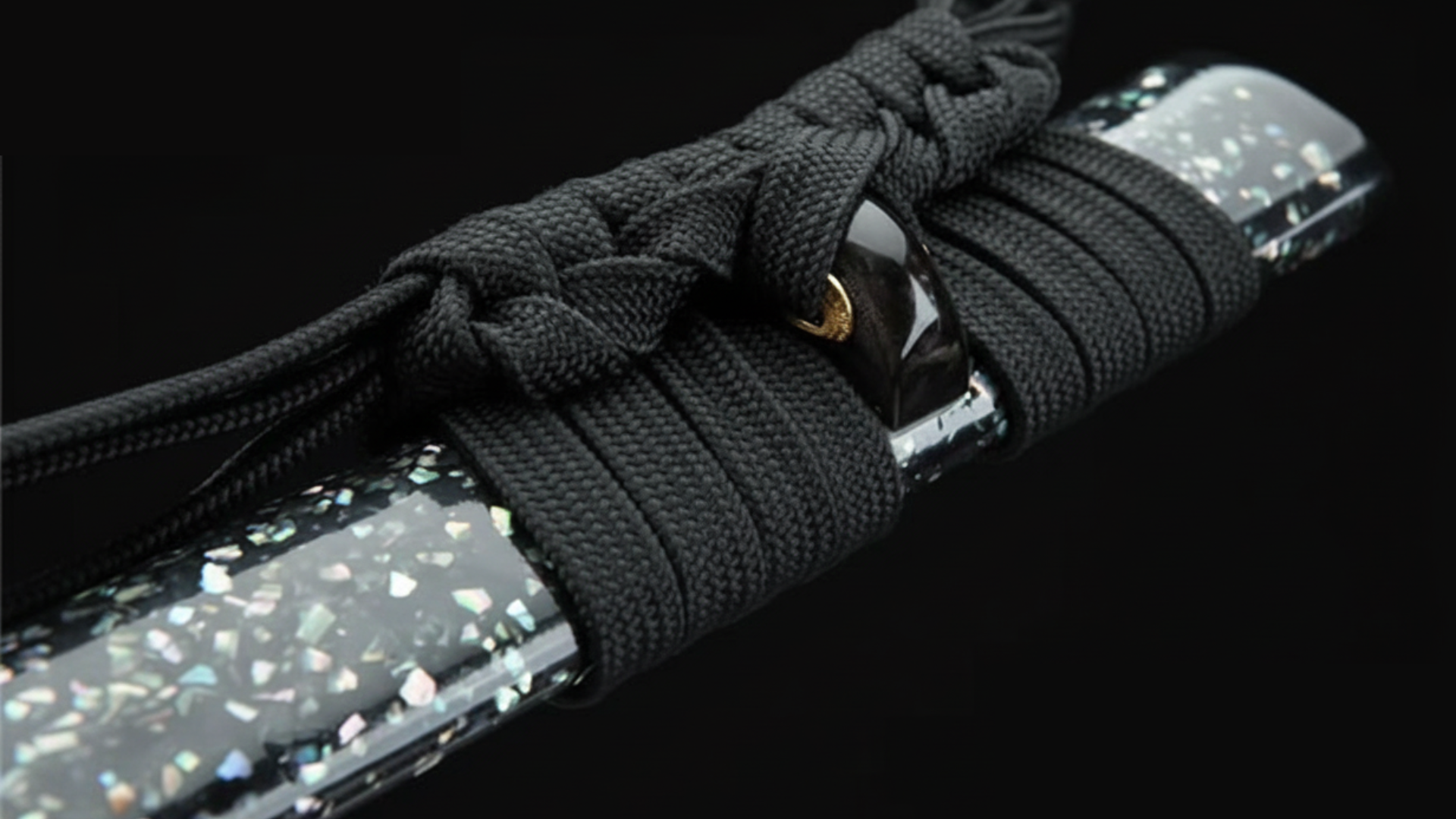 Sa monture noire associe un tressage cuir à un samegawa véritable, offrant une texture dense et authentique. Le saya noir est orné d’incrustations nacrées “shell” qui créent des reflets lumineux sous la lumière. La tsuba en laiton plaqué argent, accompagnée d’un habaki et de seppa métalliques, apporte une touche contrastée et contemporaine à l’ensemble.