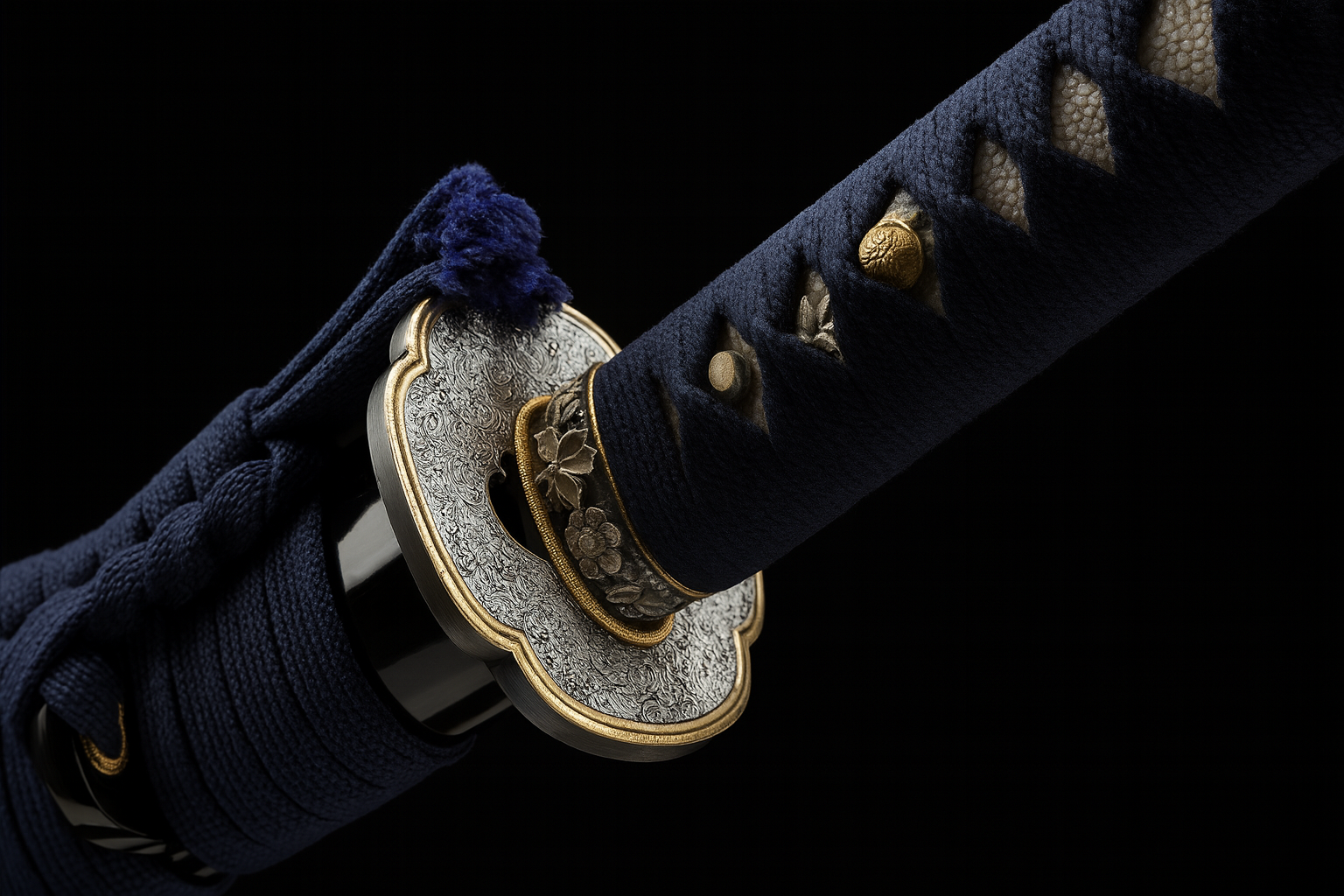Le manche (tsuka) de 26 cm est tressé sur une base en bois recouverte de samegawa, tandis que la garde (tsuba) en laiton massif renforce l’allure sobre et traditionnelle de l’ensemble. Le fourreau (saya) noir brillant est accompagné d’un sageo bleu tressé, complétant une finition élégante et cohérente.