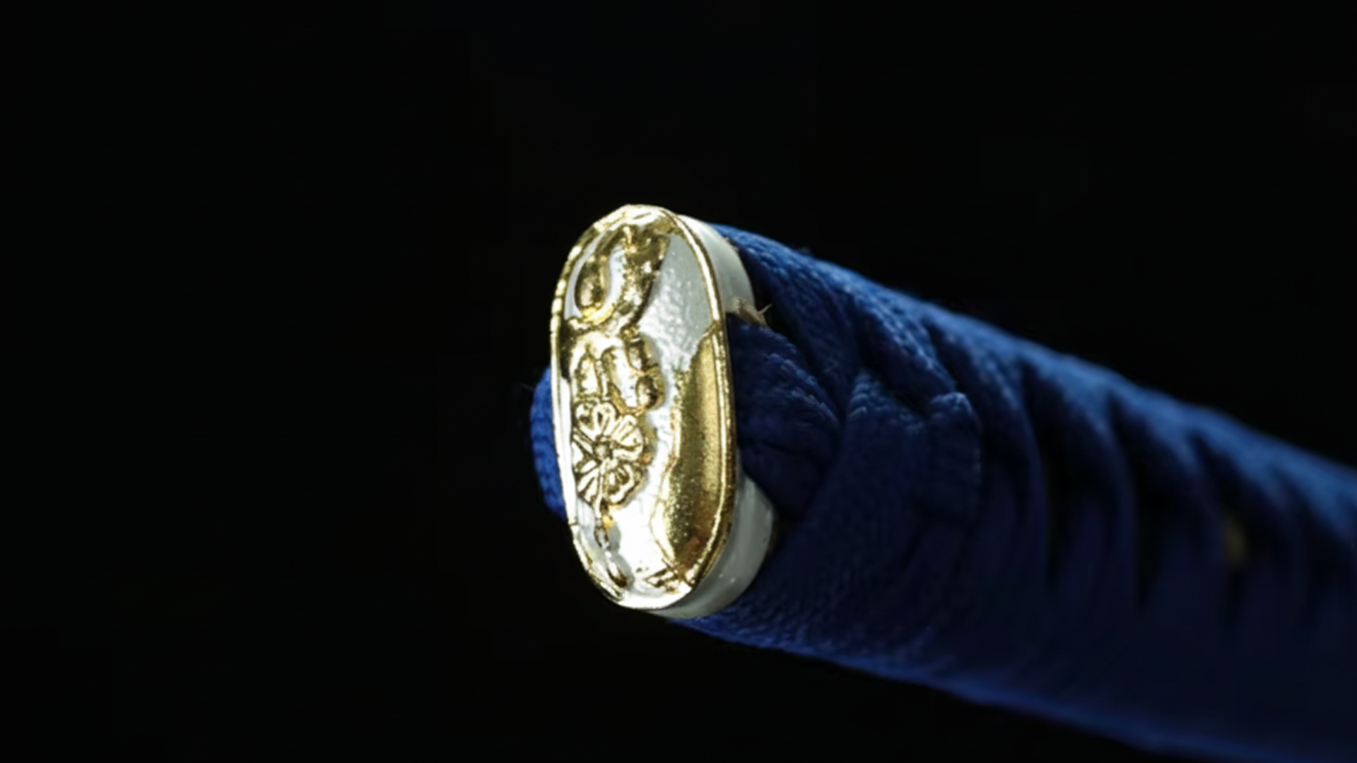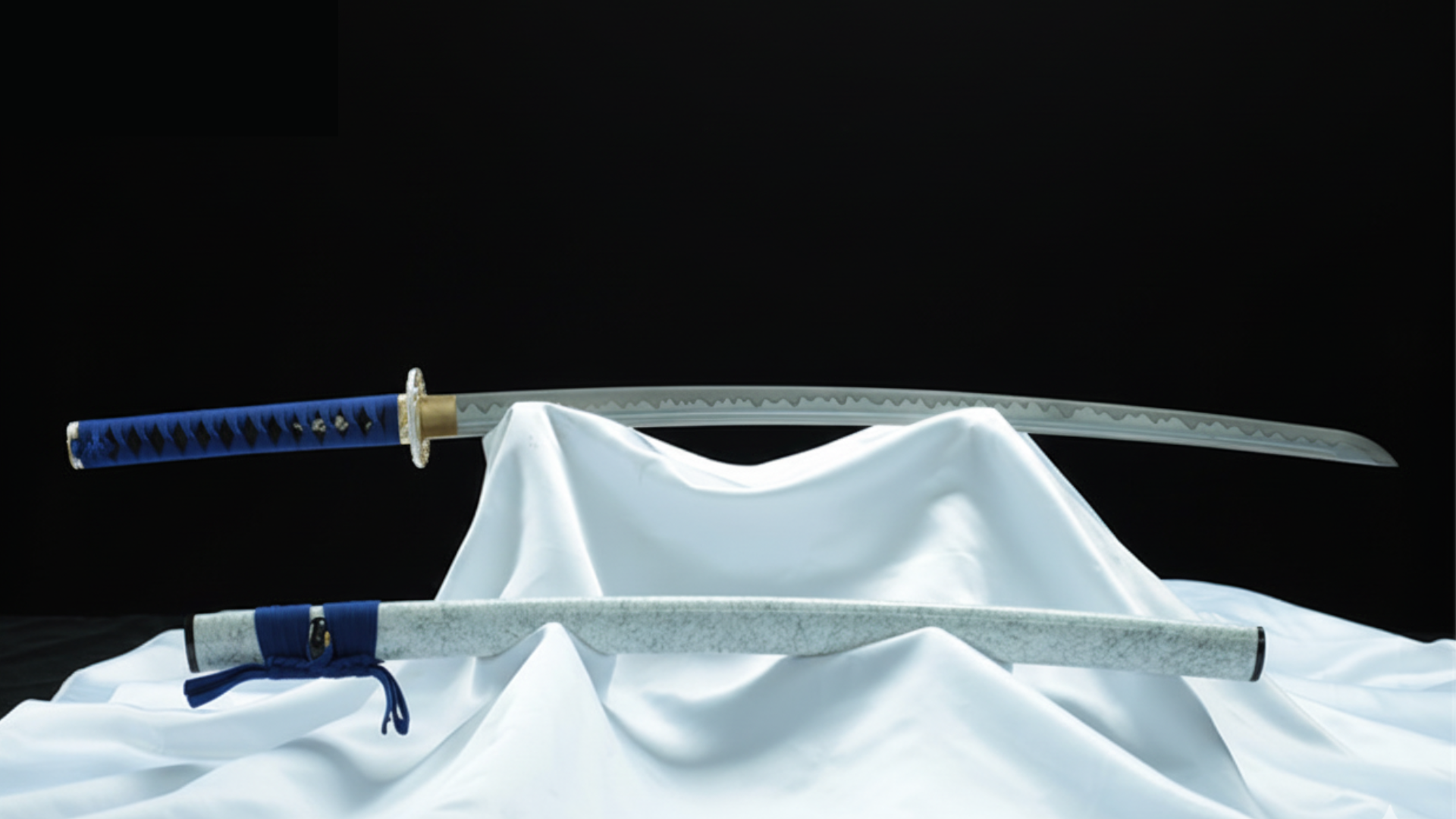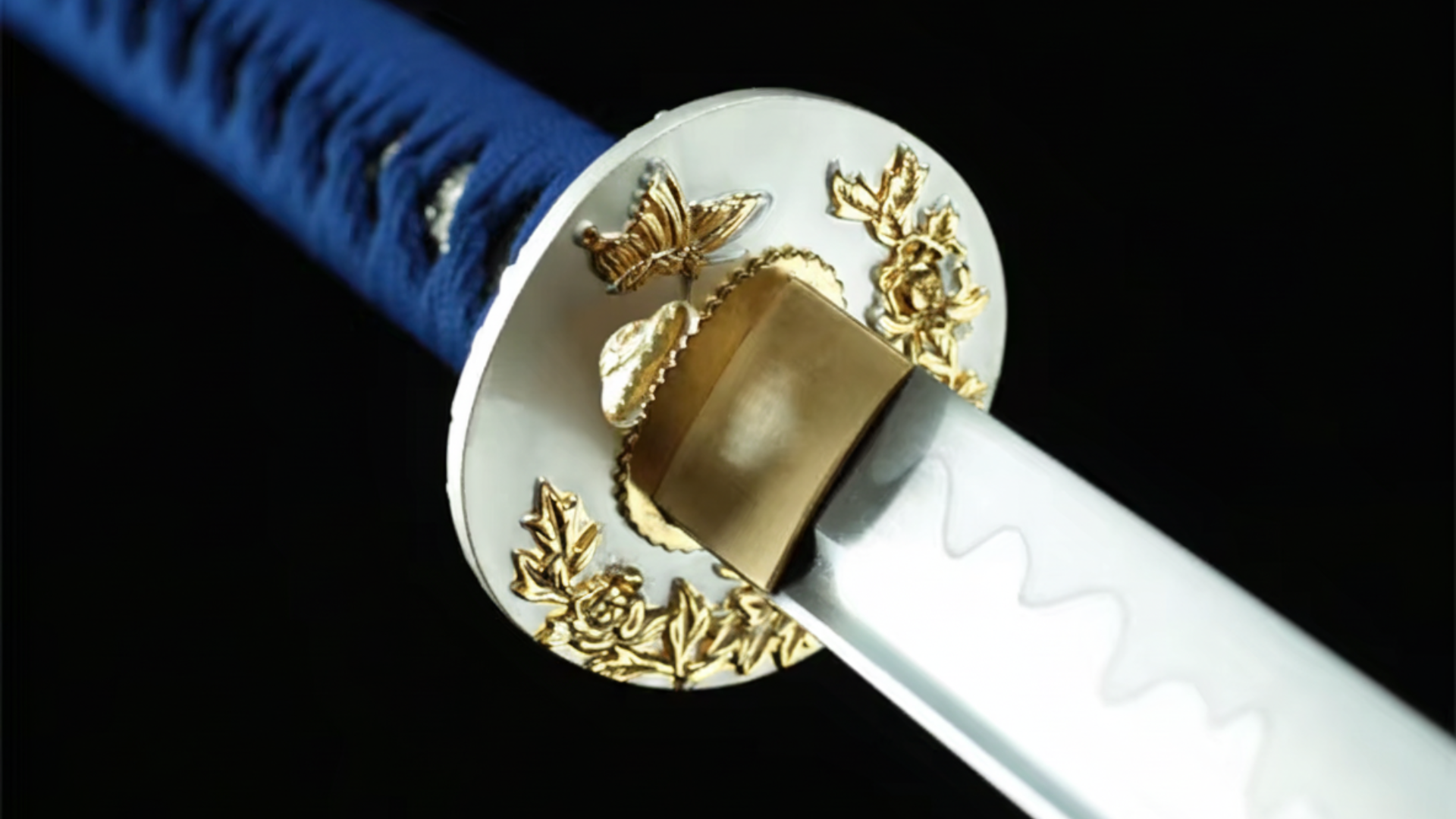 La saya blanche à effet marbré présente des veines délicates rappelant les sabres de cérémonie, tandis que la tsuka adopte un tressage bleu profond qui crée un contraste net et raffiné. La tsuba mêle blanc et doré dans une sculpture florale et papillon subtile, renforçant l’harmonie d’ensemble. Le sageo bleu assorti complète ce katana au caractère visuel clair, élégant et singulier.