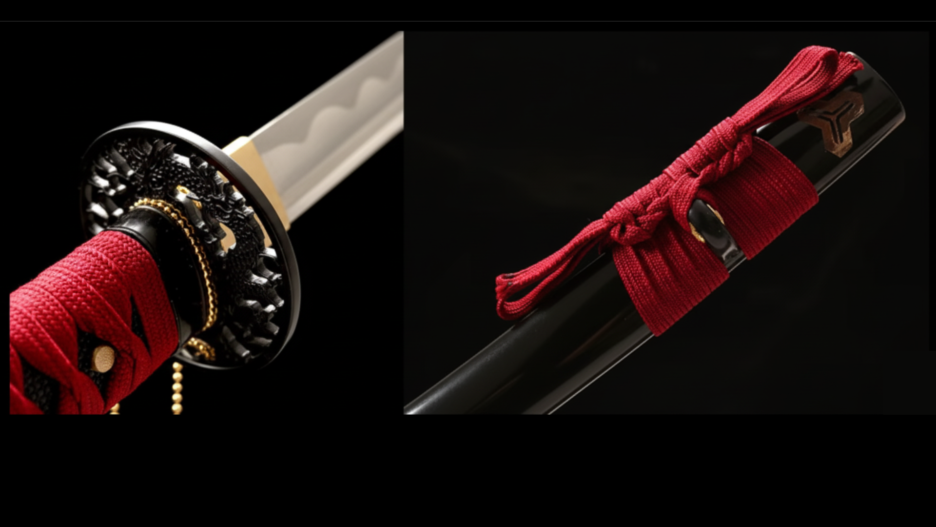 Sa lame en acier carbone dévoile une ligne de trempe décorative inspirée des hamon classiques. La tsuba ajourée noire adopte un motif traditionnel, apportant une dimension artisanale à l’ensemble. La tsuka combine un tressage rouge expressif à une base en bois recouverte de peau de raie synthétique, renforçant le contraste avec le fourreau sombre.